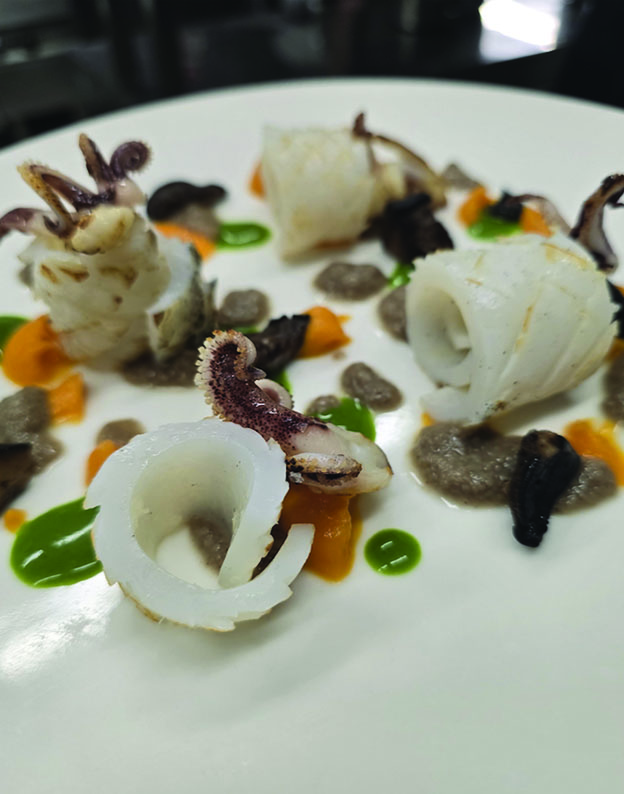 In questo scenario monumentale e suggestivo, la cucina non è un semplice servizio, ma un atto di ascolto. Andrea ha perfezionato un metodo che coinvolge i cinque sensi in modo totale. Tutto parte dalla vista, con l’impatto estetico del piatto, per poi passare all'olfatto, che prepara il terreno al gusto. Ma per lui l'esperienza non si ferma qui: il gusto si intreccia con il tatto, attraverso la consistenza del cibo in bocca, fino ad arrivare alla sfida più complessa, quella dell'udito. Attraverso il suono del cibo e l'atmosfera sonora che crea, Andrea cerca quella perfezione sensoriale capace di incantare l'ospite.